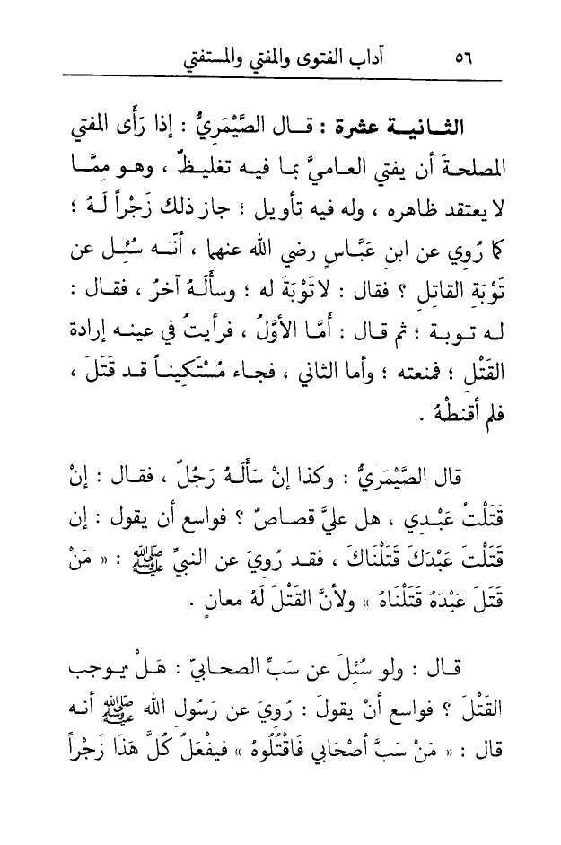 الثَّانِيَة عشرَة قَالَ الصَّيْمَرِيّ إِذا رأى الْمُفْتِي الْمصلحَة أَن يُفْتِي الْعَاميّ بِمَا فِيهِ تغليظٌ وَهُوَ مِمَّا لَا يعْتَقد ظَاهره وَله فِيهِ تَأْوِيل جَازَ ذَلِك زجرا لَهُ كَمَا رُوِيَ عَن ابْن عَبَّاس رَضِي الله عَنْهُمَا أَنه سُئِلَ عَن تَوْبَة الْقَاتِل فَقَالَ لَا تَوْبَة لَهُ وَسَأَلَهُ آخر فَقَالَ لَهُ تَوْبَة ثمَّ قَالَ أما الأول فَرَأَيْت فِي عينه إِرَادَة الْقَتْل فمنعته وَأما الثَّانِي فجَاء مستكيناً قد قتل فَلم أقنطه