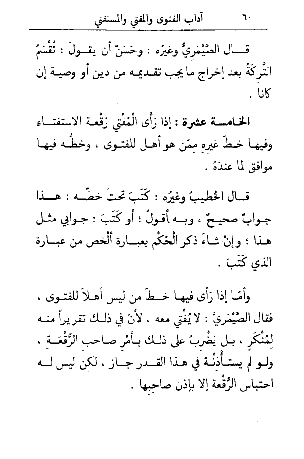الْخَامِسَة عشرَة إِذا رأى الْمُفْتِي رقْعَة الاستفتاء وفيهَا خطّ غَيره مِمَّن هُوَ أهلٌ للْفَتْوَى وخطُّه فِيهَا مُوَافق لما عِنْده