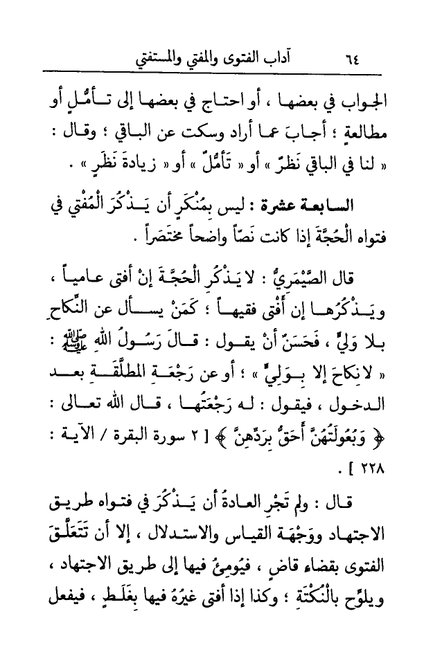 السَّابِعَة عشرَة لَيْسَ بمنكَر أَن يذكر الْمُفْتِي فِي فتواه الْحجَّة إِذا كَانَت نصا وَاضحا مُخْتَصرا