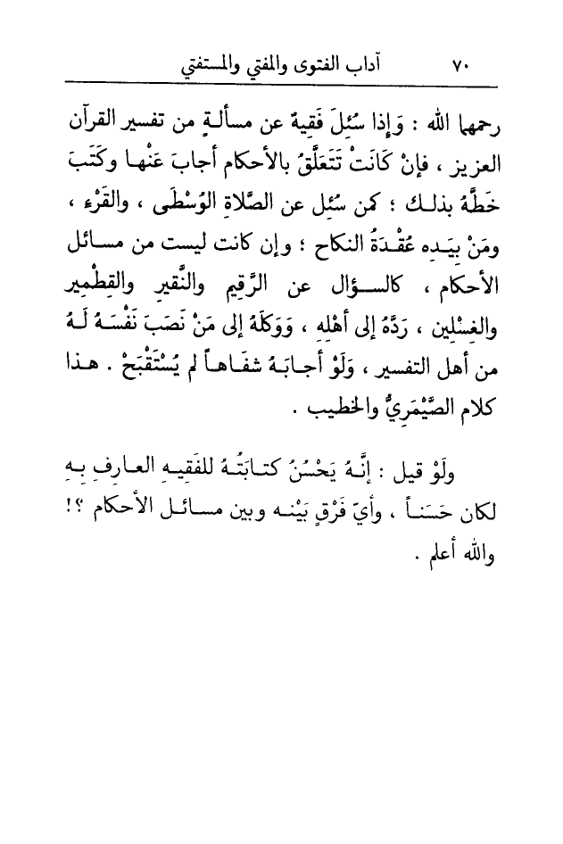 رحمهمَا الله وَإِذا سُئِلَ فَقِيه عَن مسألةٍ من تَفْسِير الْقُرْآن الْعَزِيز فَإِن كَانَت تتَعَلَّق بِالْأَحْكَامِ أجَاب عَنْهَا وَكتب خطه بذلك كمن سُئِلَ عَن الصَّلَاة الْوُسْطَى والقرء وَمن بِيَدِهِ عقدَة النِّكَاح وَإِن كَانَت لَيست من مسَائِل الْأَحْكَام كالسؤال عَن الرقيم والنقير والقطمير والغسلين رده إِلَى أَهله ووكله إِلَى من نصب نَفسه لَهُ من أهل التَّفْسِير وَلَو أَجَابَهُ شفاها لم يستقبح هَذَا كَلَام الصَّيْمَرِيّ والخطيب