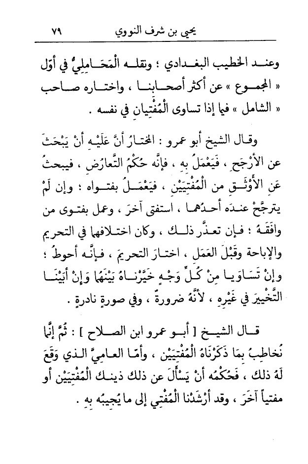وَقَالَ الشَّيْخ أَبُو عَمْرو الْمُخْتَار أَن عَلَيْهِ أَن يبْحَث عَن الْأَرْجَح فَيعْمل بِهِ فَإِنَّهُ حكم التَّعَارُض فيبحث عَن الأوثق من المفتيين فَيعْمل بفتواه وَإِن لم يتَرَجَّح عِنْده أَحدهمَا استفتى آخر وَعمل بفتوى من وَافقه فَإِن تعذر ذَلِك وَكَانَ اخْتِلَافهمَا فِي التَّحْرِيم وَالْإِبَاحَة وَقبل الْعَمَل اخْتَار التَّحْرِيم فَإِنَّهُ أحوط وَإِن تَسَاويا من كل وَجه خيرناه بَينهمَا وَإِن أَبينَا التَّخْيِير فِي غَيره لِأَنَّهُ ضَرُورَة وَفِي صُورَة نادرة