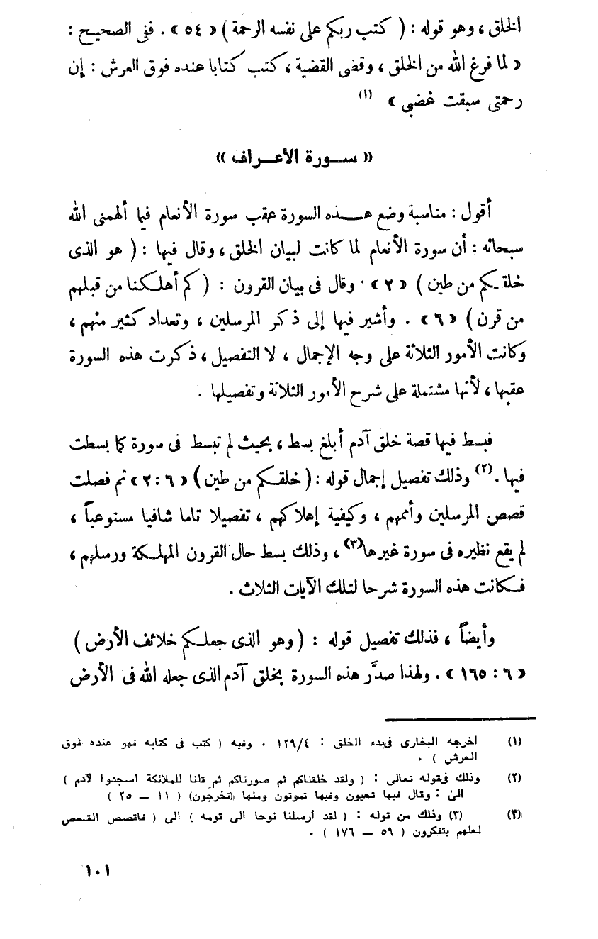 أقول مناسبة وضع هذه السورة عقب سورة الأنعام فيما ألهمني الله سبحانه أن سورة الأنعام لما كانت لبيان الخلق وقال فيها هو الذي خلقكم من طين 2 وقال في بيان القرون كم أهلكنا من قبلهم من قرن 6 وأشير فيها إلى ذكر المرسلين وتعداد كثير منهم وكانت الأمور الثلاثة على وجه الإجمال لا التفصيل ذكرت هذه السورة عقبها لأنها مشتملة على شرح الأمور الثلاثة وتفصيلها