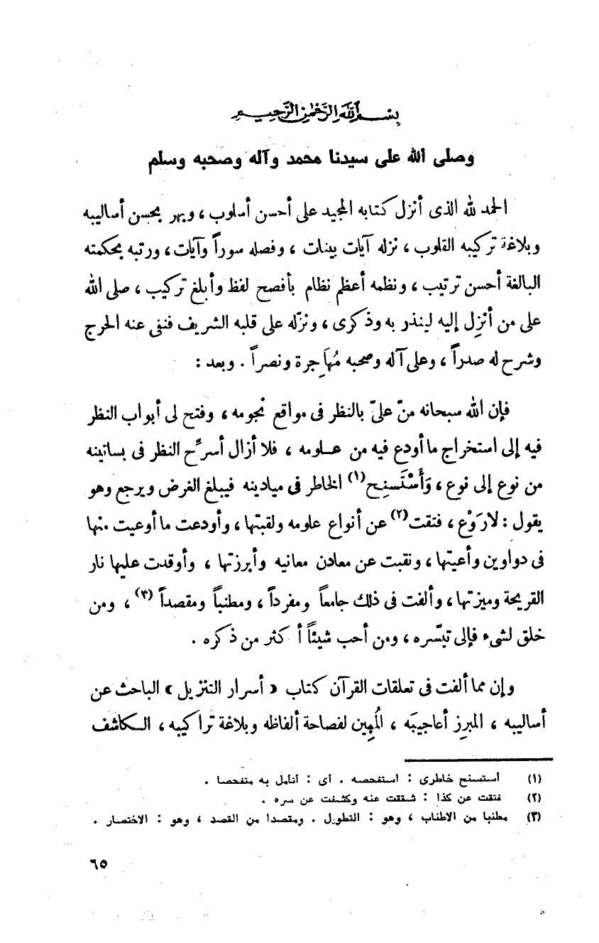بسم الله الرحمن الرحيم وصلى الله على سيدنا محمد وآله وصحبه وسلم الحمد لله الذي أنزل كتابه المجيد على أحسن أسلوب وبهر بحسن أساليبه وبلاغة تركيبه القلوب نزله آيات بينات وفصله سورا وآيات ورتبه بحكمته البالغة أحسن ترتيب ونظمه أعظم نظام بأفصح لفظ وأبلغ تركيب صلى الله على من أنزل اليه لينذر به وذكرى ونزله على قلبه الشريف فنفى عنه الحرج وشرح له صدرا وعلى آله وصحبه مهاجرة ونصرا وبعد
