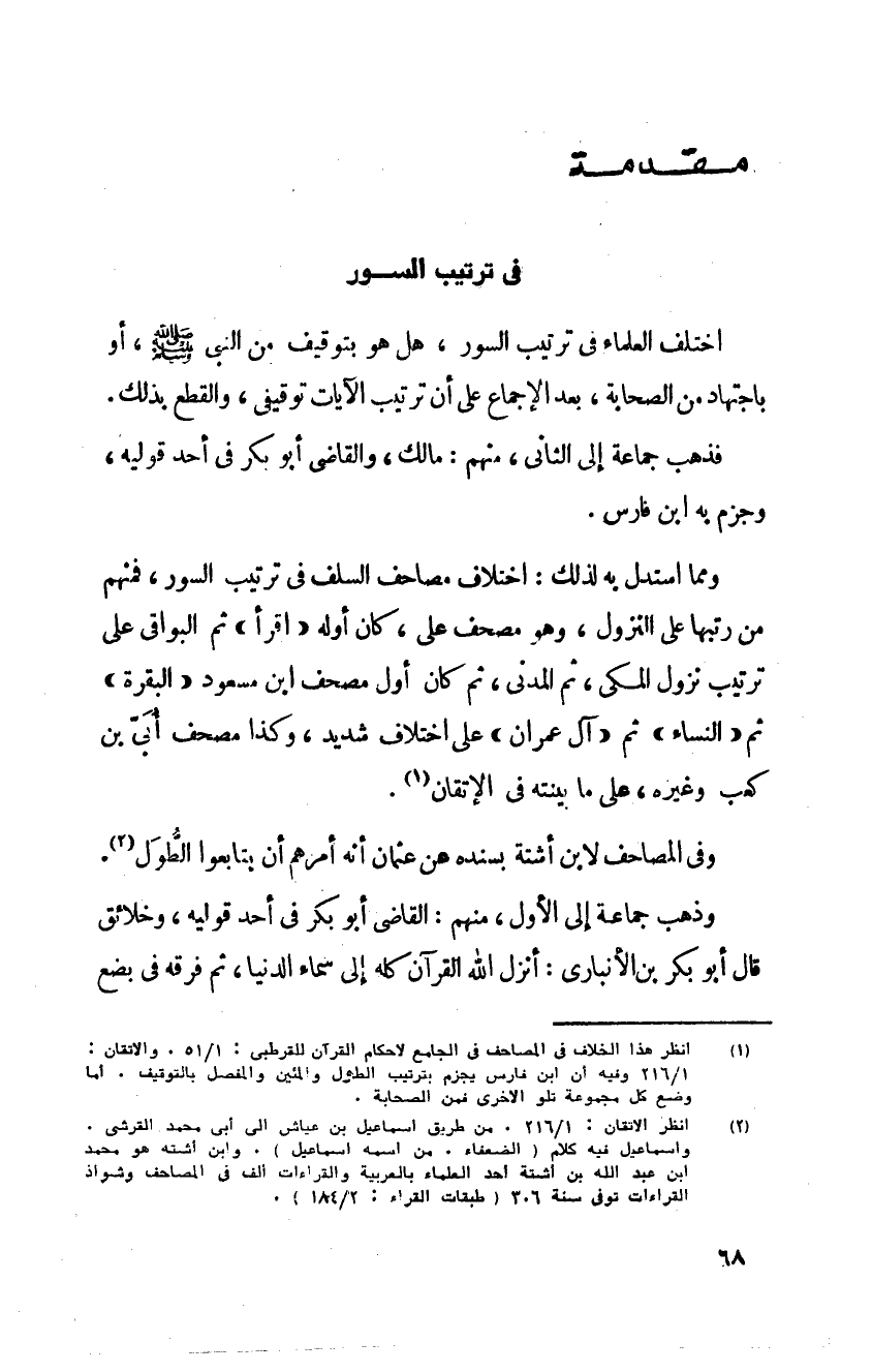 ومما استدل به لذلك اختلاف مصاحف السلف في ترتيب السور فمنهم من رتبها على النزول وهو مصحف علي كان أوله اقرأ ثم البواقي على ترتيب نزول المكي ثم المدني ثم كان أول مصحف ابن مسعود البقرة ثم النساء ثم آل عمران على اختلاف شديد وكذا مصحف أبي بن كعب وغيره على بينته في الإتقان