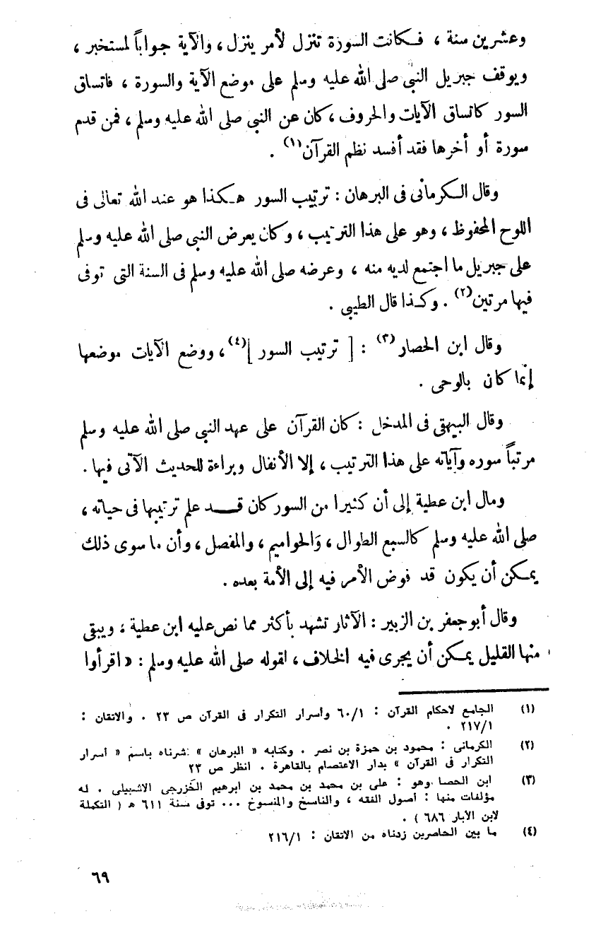 وعشرين سنة فكانت السورة تنزل لأمر ينزل والآية جوابا لمستخبر ويوقف جبريل النبي صلى الله عليه و سلم على موضع الآية والسورة فاتساق السور كاتساق الآيات والحروف كان عن النبي صلى الله عليه و سلم فمن قدم سورة أو أخرها فقد أفسد نظم القرآن