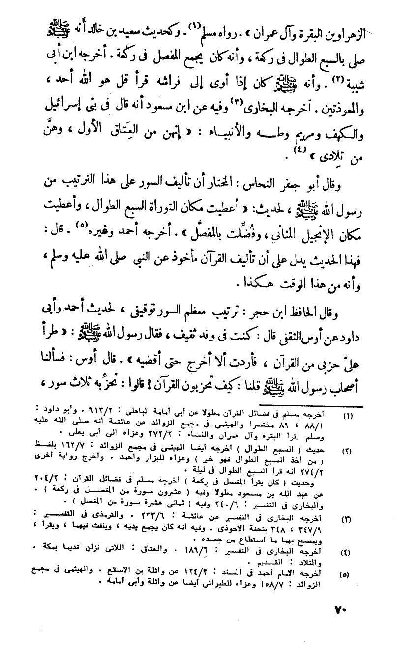 وقال أبو جعفر النحاس المختار أن تأليف السور على هذا الترتيب من رسول الله صلى الله عليه و سلم لحديث أعطيت مكان التوراة السبع الطوال وأعطيت مكان الانجيل المثاني وفضلت بالمفصل أخرجه أحمد وغيره قال فهذا الحديث يدل على أن تأليف القرآن مأخوذ عن النبي صلى الله عليه و سلم وأنه من هذا الوقت هكذا