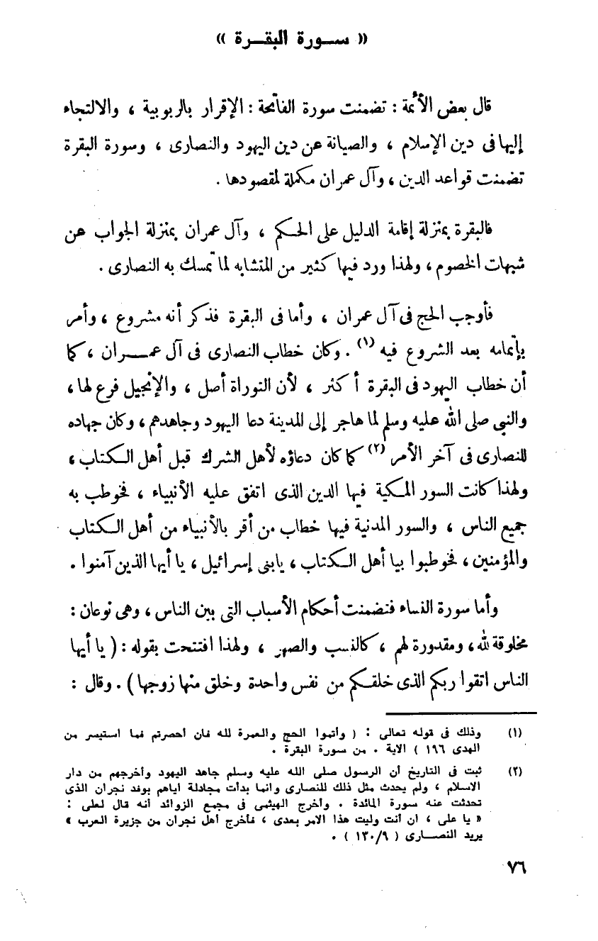 فأوجب الحج في آل عمران وأما في البقرة فذكر أنه مشروع وأمر بإتمامه بعد الشروع فيه وكان خطاب النصارى في آل عمران كما أن خطاب اليهود في البقرة أكثر لأن التوراة أصل والإنجيل فرع لها والنبي صلى الله عليه و سلم لما هاجر الى المدينة دعا اليهود وجاهدهم وكان جهاده للنصارى في آخر الأمر كما كان دعاؤه لأهل الشرك قبل أهل الكتاب ولهذا كانت السور المكية فيها الدين الذي اتفق عليه الأنبياء فخوطب به جميع الناس والسور المدنية فيها خطاب من أقر بالأنبياء من أهل الكتاب والمؤمنين فخوطبوا بيا أهل الكتاب يا بني اسرائيل يا أيها الذين آمنوا