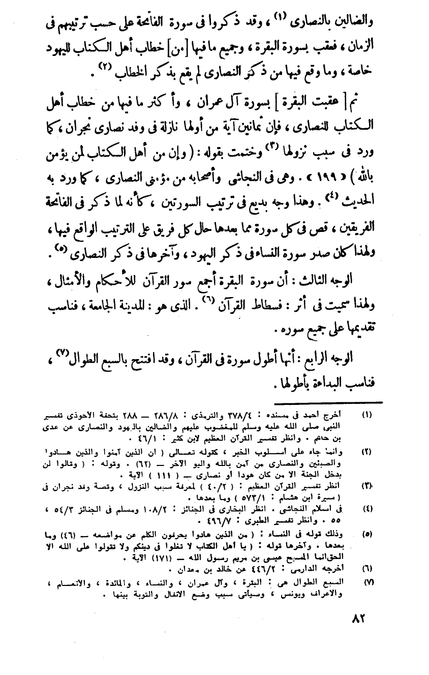 ثم عقبت البقرة بسورة آل عمران وأكثر ما فيها من خطاب أهل الكتاب للنصارى فإن ثمانين آيه من أولها نازلة في وفد نصارى نجران كما ورد في سبب نزولها وختمت بقوله وان من أهل الكتاب لمن يؤمن بالله 199 وهي في النجاشي وأصحابه من مؤمني النصارى كما ورد به الحديث وهذا وجه بديع في ترتيب السورتين كأنه لما ذكر في الفاتحة الفريقين قص في كل سورة مما بعدها حال كل فريق على الترتيب الواقع فيها ولهذا كان صدر سورة النساء في ذكر اليهود وآخرها في ذكر النصارى