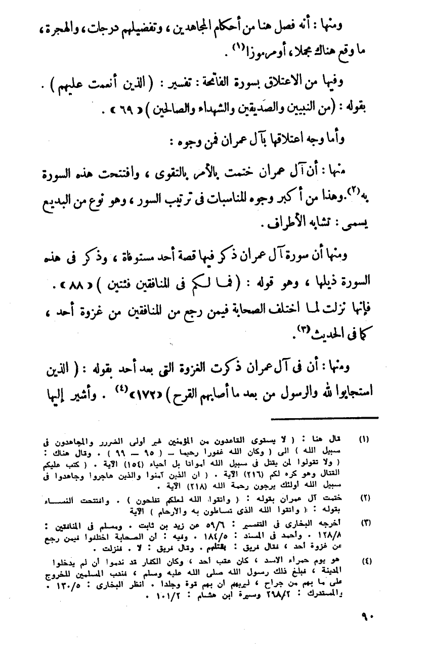 ومنها أن سورة آل عمران ذكر فيه قصة أحد مستوفاة وذكر في هذه السورة ذيلها وهو قوله فما لكم في المنافقين فئتين 88 فإنها نزلت لما اختلف الصحابة فيمن رجع من المنافقين من غزوة أحد كما في الحديث