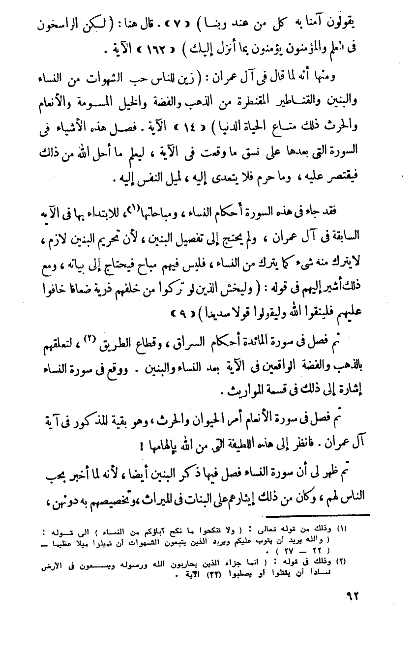 ومنها أنه لما قال في آل عمران زين للناس حب الشهوات من النساء والبنين والقناطير المقنطرة من الذهب والفضة والخيل المسومة والأنعام والحرث ذلك متاع الحياة الدنيا 14 فصل هذه الأشياء في السورة التي بعدها على نسق ما وقعت في الآية ليعلم ما أحل الله من ذلك فيقتصر عليه وما حرم فلا يتعدى إليه لميل النفس إليه
