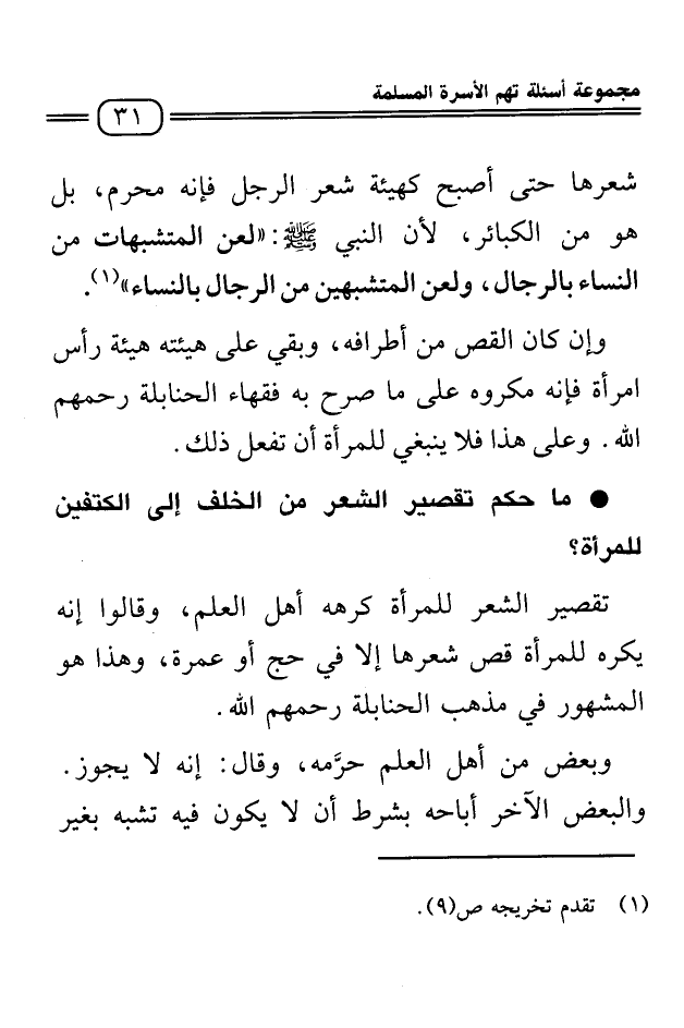 شعرها حتى اصبح كهيئة شعر الرجل فإنه محرم، بل هو من الكبائر، لأن النبي صلى الله عليه وسلم: "لعن المتشبهات من النساء بالرجال، ولعن المتشبهين من الرجال بالنساء" 1.