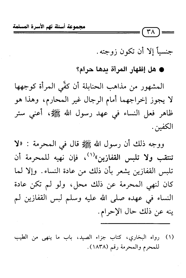 المشهور من مذاهب الحنابلة أن كفي المرأة كوجهها لا يجوز إخراجها أمام الرجال غير المحارم، وهذا هو ظاهر فعل النساء في عهد رسول الله صلى الله عليه وسلم أعني ستر الكفين.
