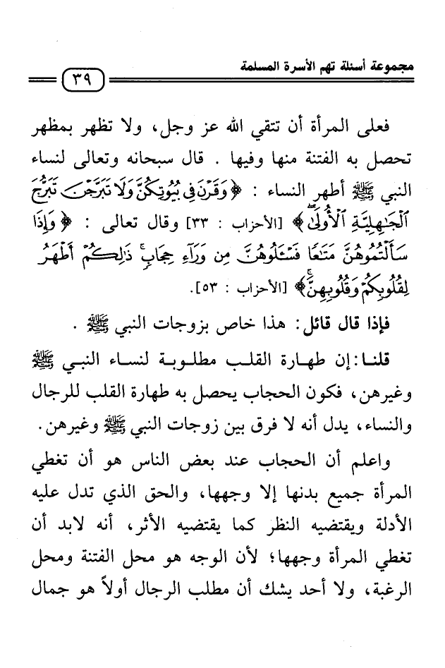 قلنا: إن طهارة القلب مطلوبة لنساء النبي صلى الله عليه وسلم وغيرهن، فكون الحجاب يحصل به طهارة القلب للرجال والنساء، يدل أنه لا فرق بين زوجات النبي صلى الله عليه وسلم وغيرهن.