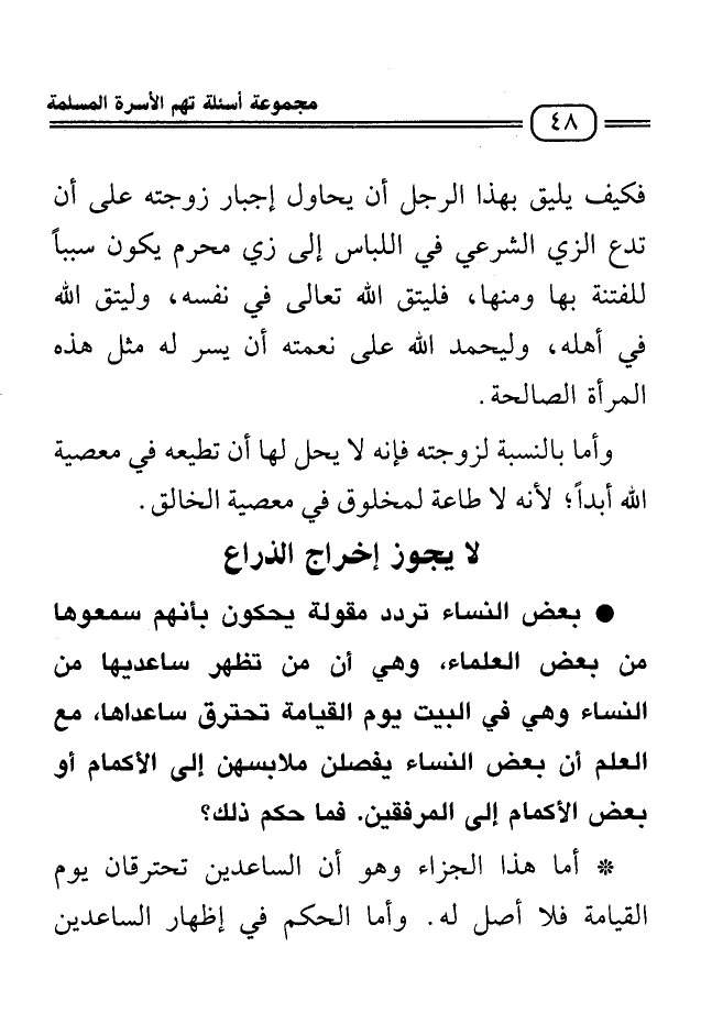 بعض النساء تردد مقولة يحكون بأنهم سمعوا من بعض العلماء، وهي أن من تظهر ساعديها من النساء وهي في البيت يوم القيامة تحترق ساعداها، مع العلم أن بعض النساء يفصلن ملابسهن إلي الأكمام أو بعض الأكمام إلي المرفقين. فما حكم ذلك؟