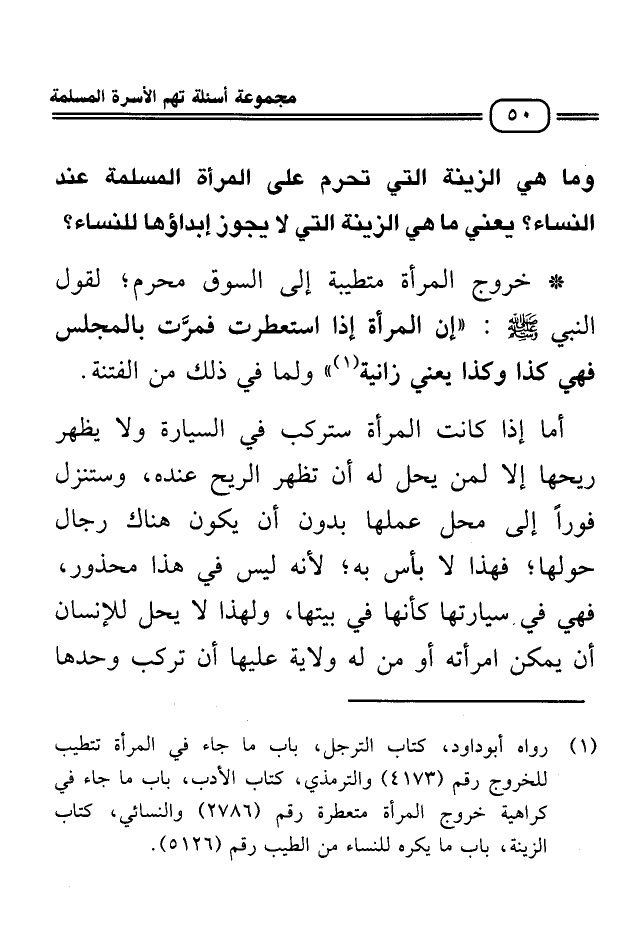 1 رواه أبو داوود، كتاب الترجل، باب ما جاء في المرأة تتطيب للخروج رقم 4173 والترمزي، كتاب الأدب، باب ما جاء في كراهية خروج المرأة متعطرة رقم 2786 والنسائي، كتاب الزينة، باب ما يكره للنساء من الطيب رقم 5126.