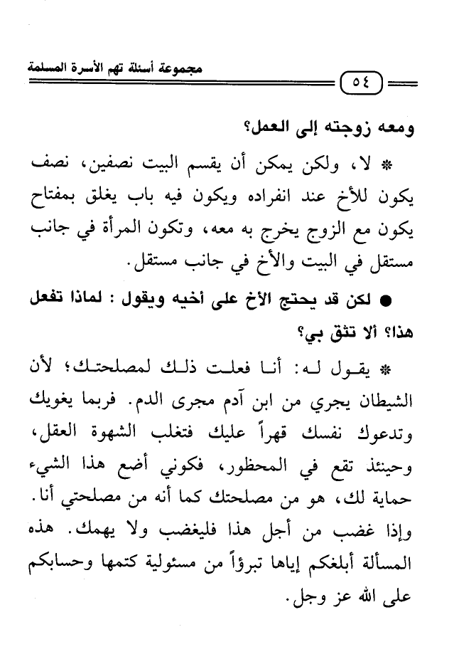 يقول له: أنا فعلت ذلك لمصلحتك، لأن الشيطان يجري من ابن آدم مجرى الدم. فربما يغويك وتدعوك نفسك قهرا عليك فتغلب الشهوة العقل، وحينئذ تقع في المحظور، فكوني أضع هذا الشي حماية لك، هو من مصلحتك كما أنه من مصلحتي أنا. وإذا غضب من أجل هذا ليغضب ولا يهمك. هذه المسألة أبلغكم إياها تبرؤا من مسئولية كتمها وحسابكم على الله عز وجل.