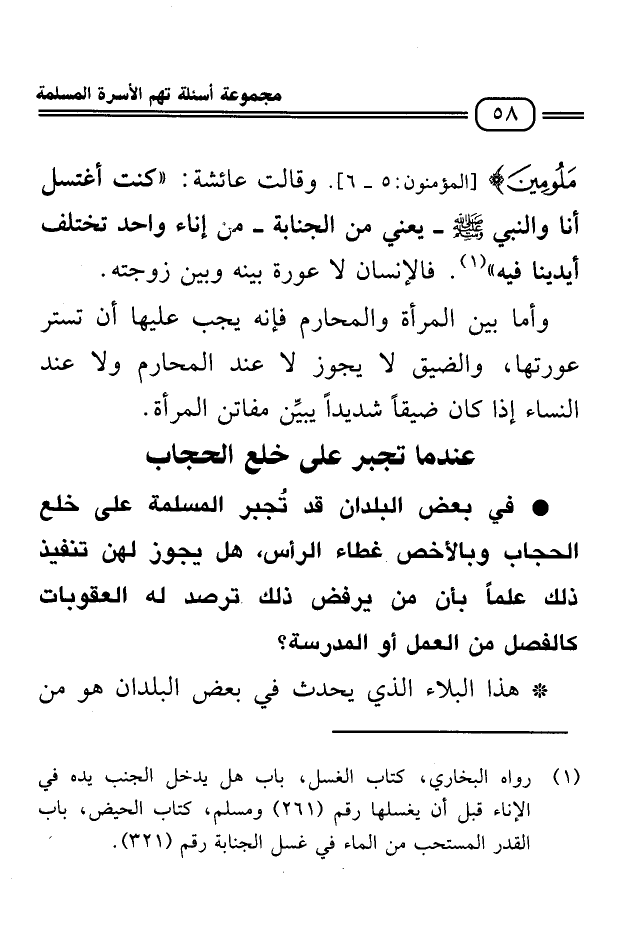مَلُومِينَ} [المؤمنون5- 6] وقالت عائشة: "كنت اغتسل أنا والنبي صلى الله عليه وسلم ـ يعني من الجنابة ـ من إناء واحد تختلف أيدينا فيه" 1 فالإنسان لا عورة بينه وبين زوجته.