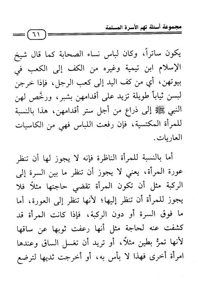 يكون ساترا، وكان لباس نساء الصحابة كما قال شيخ الإسلام ابن تميمة وغيره من الكف إلي الكعب في بيوتهن، أي كف من كف اليد إلي كعب الرجل، فإذا خرجن لبسن ثيابا طويلة تزيد على أقدامهن بشبر، ورخص لهن النبي صلى الله عليه وسلم إلي ذراع من أجل ستر أقدامهن، هذا بالنسبة للمرأة المكتسية، فإن رفعت اللباس فهي من الكاسيات العاريات.