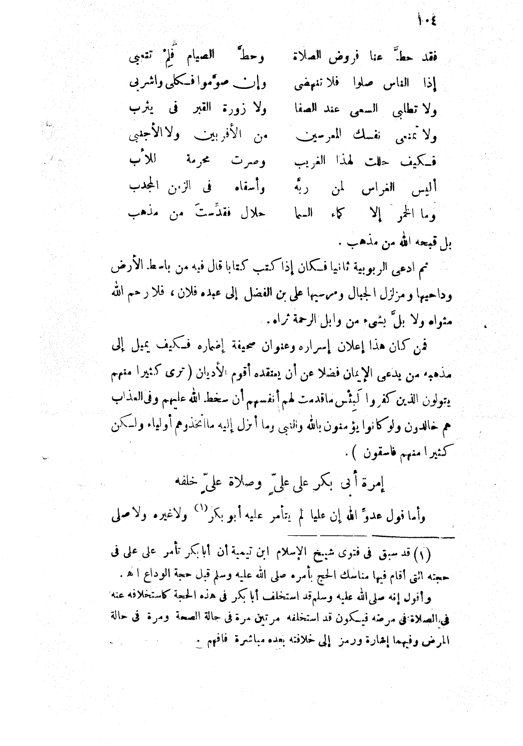 وأما قول عدو الله: إن عليا لم يتأمر عليه أبو بكر ولا غيره، ولا صلى