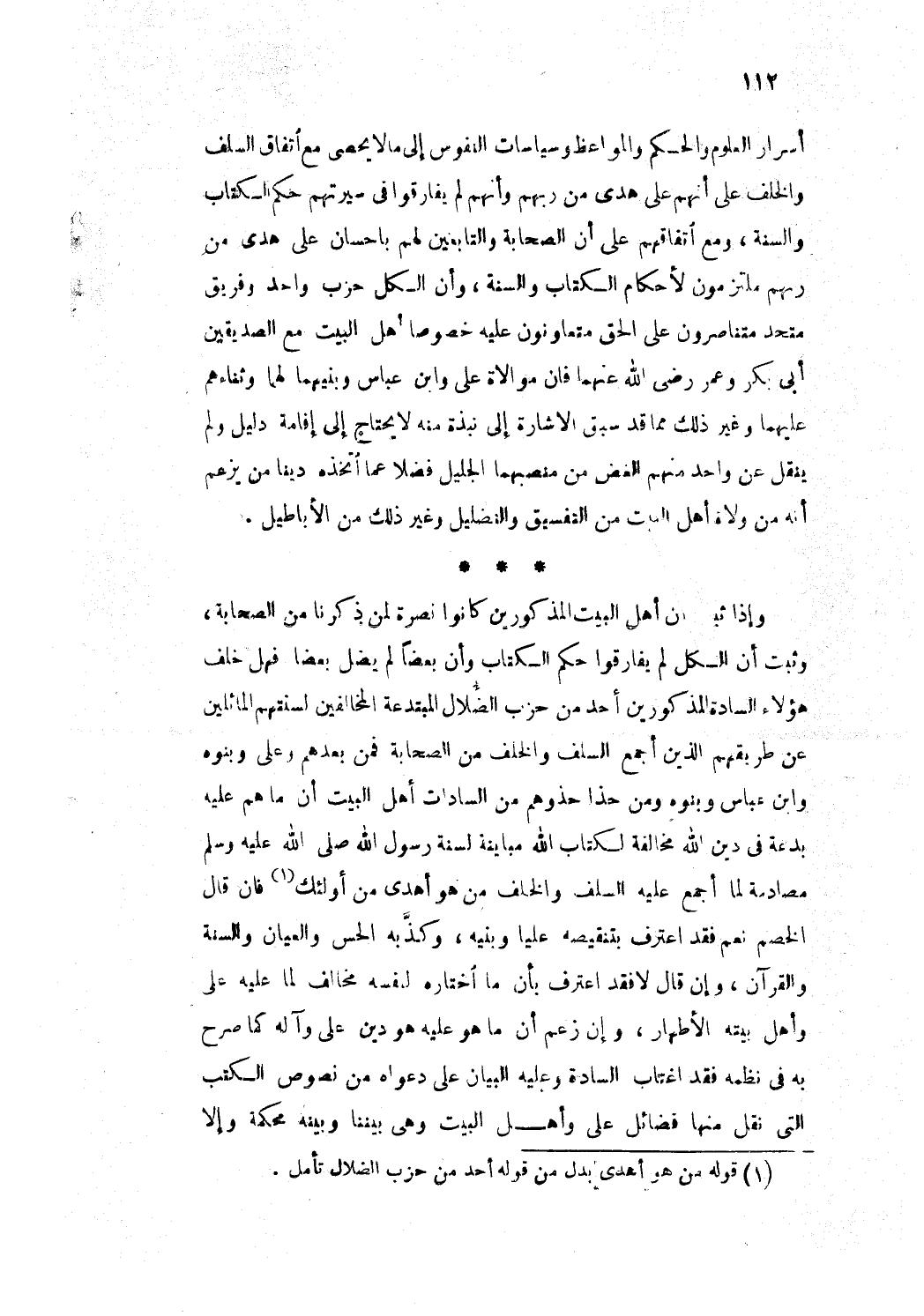 أسرار العلوم والحكم والمواعظ وسياسات النفوس، إلى ما لا يحصى. مع اتفاق السلف والخلف على أنهم على هدى من ربهم، وأنهم لم يفارقوا في سيرتهم حكم الكتاب والسنة. ومع اتفاقهم على أن الصحابة والتابعين لهم بإحسان على هدى من ربهم ملتزمون لأحكام الكتاب والسنة، وأن الكل حزب واحد وفريق متحد متناصرون على الحق متعاونون عليه، خصوصا أهل البيت مع الصديقين أبي بكر وعمر رضي الله عنهما، فإن موالاة علي وابن عباس وبنيهما لهما وثناءهم عليهما وغير ذلك مما سبق الإشارة إلى نبذة منه لا يحتاج إلى إقامة دليل. ولم ينقل عن واحد منهم الغض من منصبهما الجليل فضلا عما اتخذه دينا من يزعم أنه من ولاة أهل البيت من التفسيق والتضليل وغير ذلك من الأباطيل.