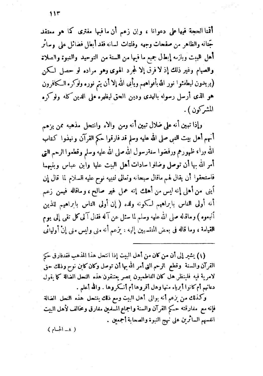 أقمنا الحجة فيها على دعوانا. وإن زعم أن ما فيها مفترى كما هو معتقد جنانه والظاهر من صفحات وجهه وفلتات لسانه فقد أبطل فضائل علي وسائر أهل البيت، ويلزمه إبطال جميع ما فيها من السنة والتوحيد والنبوة والصلاة والصيام وغير ذلك إذ لا فرق إلا لمجرد الهوى وهو مراده لو حصل عليه. ولكن {يريدون ليطفئوا نور الله بأفواههم والله متم نوره ولو كره الكافرون. هو الذي أرسل رسوله بالهدى ودين الحق ليظهره على الدين كله ولو كره المشركون}.