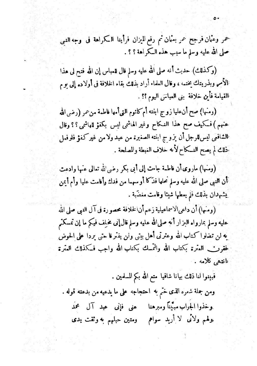 ومنها: أن داعي الإسماعيلية زعم أن الخلافة محصورة في آل النبي - صلى الله عليه وسلم - بما رواه البزار أنه - صلى الله عليه وسلم - قال: «إني مخلف فيكم ما إن تمسكتم به لن تضلوا كتاب الله وعترتي أهل بيتي، ولن يقترقا حتى يردا علي الحوض». فقرن العترة بكتاب الله والتمسك بكتاب الله واجب فكذلك العترة. انتهى كلامه.
