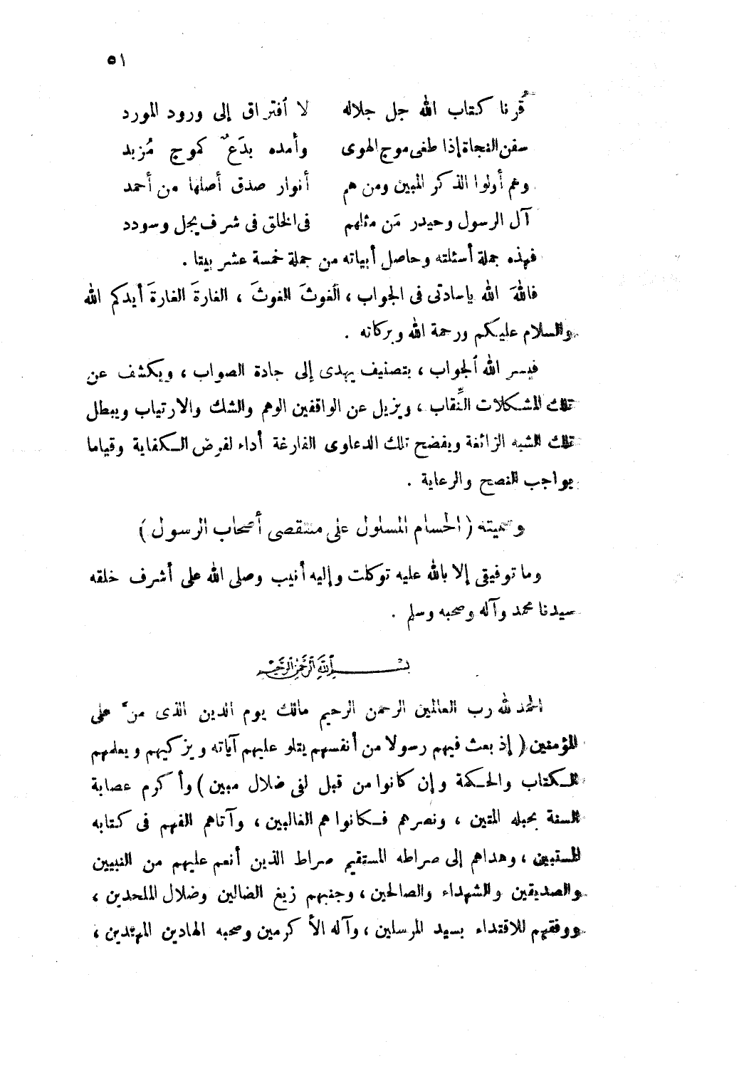 وله الحمد، الحمد لله رب العالمين، الرحمن الرحيم، مالك يوم الدين، الذي من على المؤمنين، إذ بعث فيهم رسولا من أنفسهم يتلو عليهم آياته ويزكيهم ويعلمهم الكتاب والحكمة وإن كانوا من قبل لفي ضلال مبين، وأكرم عصابة السنة بحبله المتين، ونصرهم فكانوا هم الغالبين، وآتاهم الفهم في كتابه المستبين، وهداهم الصراط المستقيم، صراط الذين أنعم عليهم من النبيين والصديقين والشهداء والصالحين، وجنبهم زيغ الضالين، وضلال الملحدين، ووفقهم للاقتداء بسيد المرسلين، وآله الأكرمين، وصحبه الهادين المهتدين،