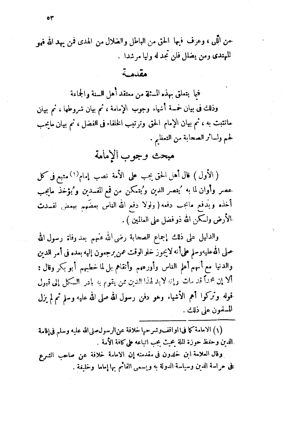 وذلك في بيان خمسة أشياء: وجوب الإمامة، ثم بيان شروطها، ثم بيان ما تثبت به، ثم بيان الإمام الحق، وترتيب الخلفاء في الفضل، ثم بيان ما يجب لهم ولسائر الصحابة من التعظيم.