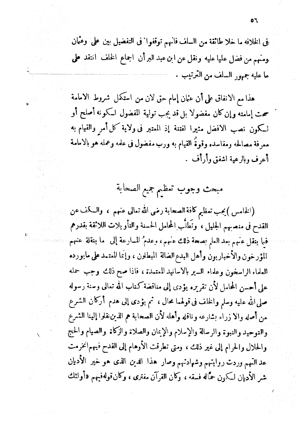 في الخلافة ما خلا طائفة من السلف فإنهم توقفوا في التفضيل بين علي وعثمان، ومنهم من فضل عليا عليه، ونقل ابن عبد البر أن إجماع الخلف انعقد على ما عليه جمهور السلف من الترتيب. هذا مع الاتفاق على أن عثمان إمام حق لأن من استكمل شروط الإمامة صحت إمامته وإن كان مفضولا، بل قد تجب تولية المفضول لكونه أصلح أو لكون نصب الأفضل مثيرا فتنة، إذ المعتبر في ولاية كل أمر معرفة مصالحه ومفاسده، ورب مفضول في علمه وعمله هو بالإمامة أعرف وبالرعية أشفق وأرأف.