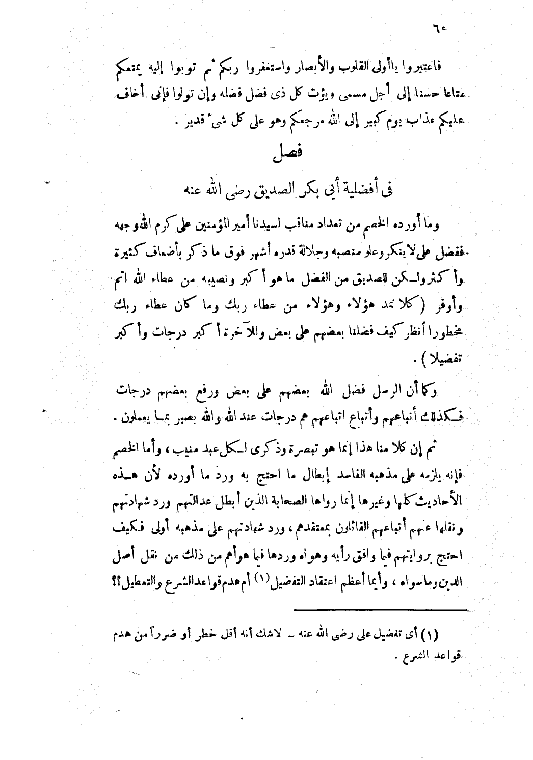 وما أورده الخصم من تعداد مناقب لسيدنا أمير المؤمنين علي كرم الله وجهه ففضل علي لا ينكر، وعلو منصبه وجلالة قدره أشهر، فوق ما ذكر بأضعاف كثيرة وأكثر، ولكن للصديق أيضا من الفضل ما هو أكبر، ونصيبه من عطاء الله أتم وأوفر، {كلا نمد هؤلاء وهؤلاء من عطاء ربك وما كان عطاء ربك محظورا. انظر كيف فضلنا بعضهم على بعض وللآخرة أكبر درجات وأكبر تفضيلا}. وكما أن الرسل فضل الله بعضهم على بعض ورفع بعضهم درجات، فكذلك أتباعهم وأتباع أتباعهم هم درجات عند الله، والله بصير بما يعملون.
