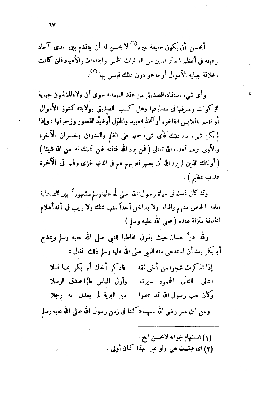 أيحسن أن يكون خليفة غيره؟ لا يحسن له أن يتقدم بين يدي آحاد رعيته في أعظم شعائر الدين من الصلوات الخمس والجماعات والأعياد، فإن كانت الخلافة جباية الأموال وما هو دون ذلك فبئس بها. وأي شيء استفاده الصديق من عقد البيعة سوى أن ولاه المسلمون جباية الزكاة وصرفها في مصارفها. وهل كسب الصديق بولايته كنوز الأموال أو تنعم بالملابس الفاخرة أو اتخذ العبيد والخول أو شيد القصور وزخرفها. وإذا لم يكن شيء من ذلك فأي شيء عمله على الظلم والعدوان وخسران الآخرة والأولى بزعم أعداء الله تعالى، {ومن يرد الله فتنته فلن تملك له من الله شيئا أولئك الذين لم يرد الله أن يطهر قلوبهم لهم في الدنيا خزي ولهم في الآخرة عذاب عظيم}.