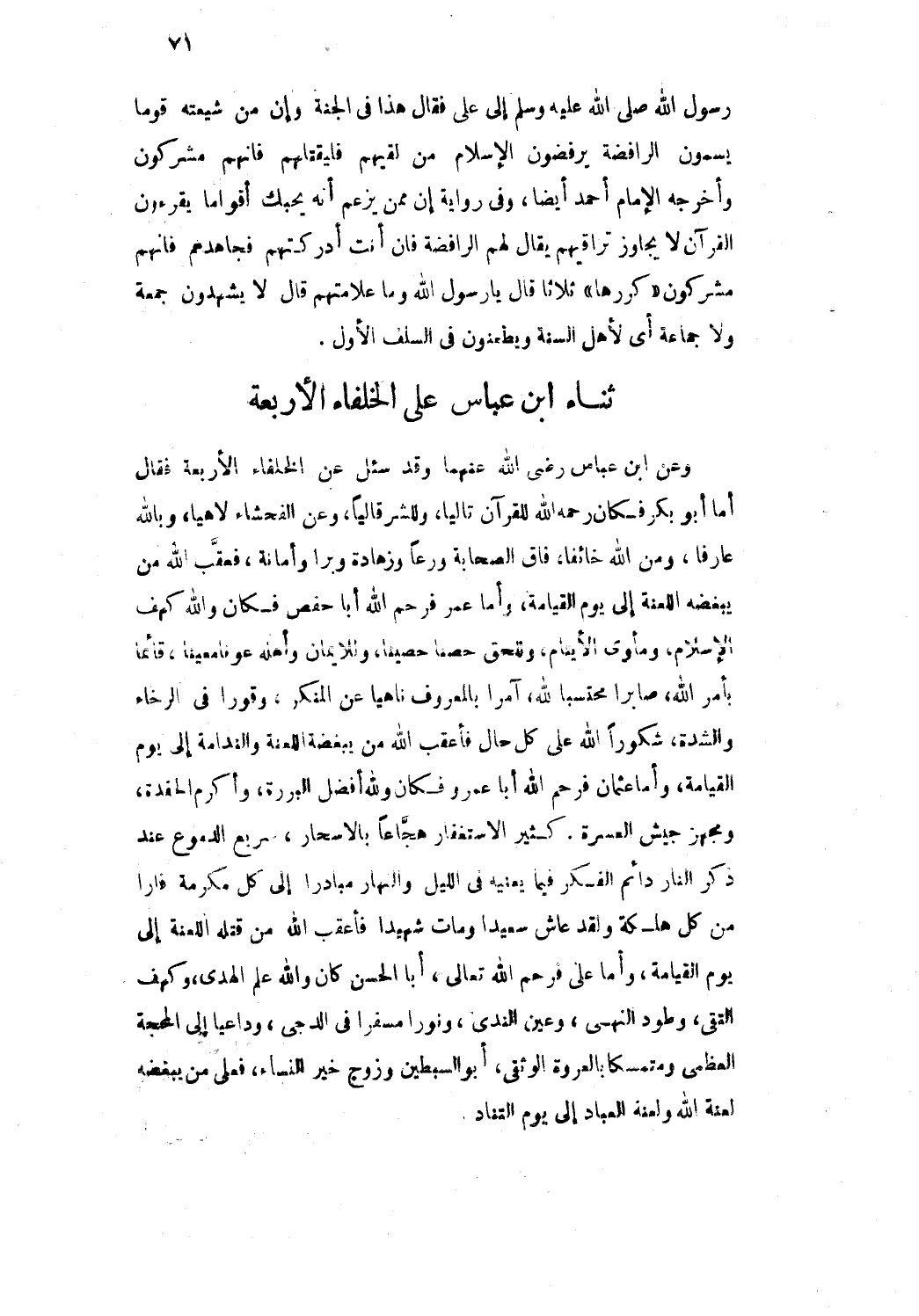 رسول الله - صلى الله عليه وسلم - إلى علي فقال: "هذا في الجنة وإن من شيعته قوما يسمون الرافضة يرفضون الإسلام من لقيهم فليقتلهم فإنهم مشركون"، وأخرجه الإمام أحمد أيضا. وفي رواية: "إن ممن يزعم إنه يحبك أقواما يقرأون القرآن لا يجاوز تراقيهم يقال لهم الرافضة فإن أنت أدركتهم فجاهدهم فإنهم مشركون" كررها ثلاثا قال: يا رسول وما علامتهم؟ قال: "لا يشهدون جمعة ولا جماعة أي لأهل السنة ويطعنون في السلف الأول".