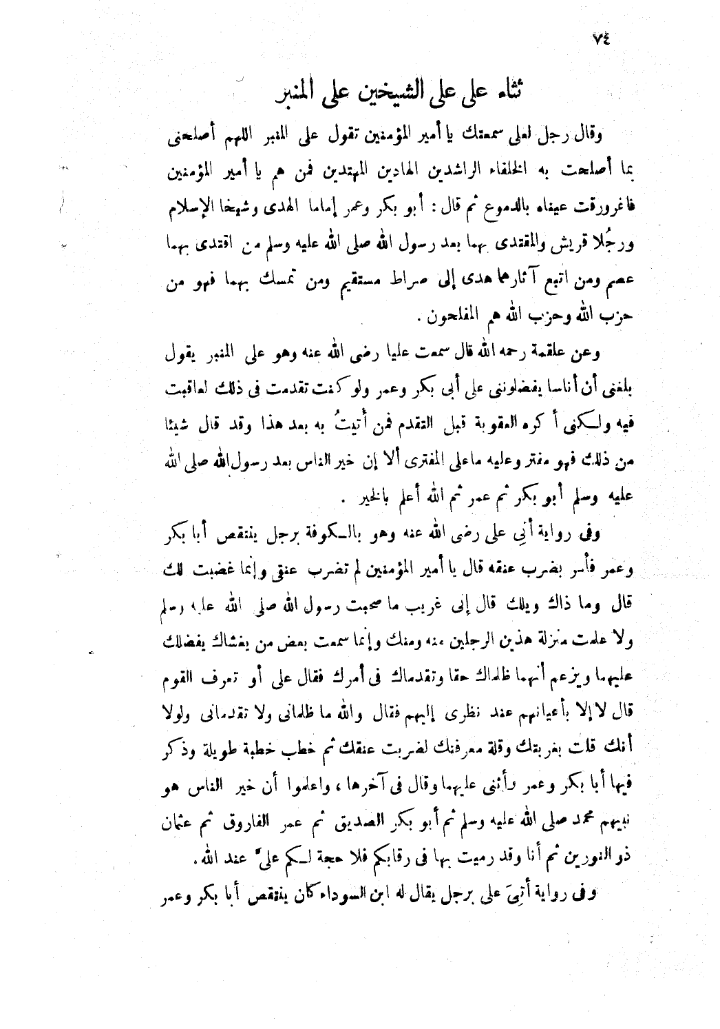 وفي رواية: أتي علي رضي الله عنه وهو بالكوفة برجل ينتقص أبا بكر وعمر فأمر بضرب عنقه قال يا أمير المؤمنين لم تضرب عنقي وإنما غضبت لك؟ قال: وما ذاك ويلك؟ قال: إني غريب ما صحبت رسول الله - صلى الله عليه وسلم -، ولا علمت منزلة هذين الرجلين منه ومنك، وإنما سمعت بعض من يغشاك يفضلك عليهما، ويزعم أنهما ظلماك حقك وتقدماك في أمرك. فقال علي: أوتعرف القوم؟ قال: لا إلا بأعيانهم عند نظري إليهم. فقال: والله ما ظلماني ولا تقدماني ولولا أنك قلت بغربتك وقلة معرفتك لضربت عنقك، ثم خطب خطبة طويلة وقال في آخرها واعلموا أن خير الناس بعد نبيهم - صلى الله عليه وسلم - أبو بكر الصديق ثم عمر الفاروق ثم عثمان ذو النورين ثم أنا وقد رميت بها في رقابكم ووراء ظهوركم فلا حجة لكم علي عند الله.