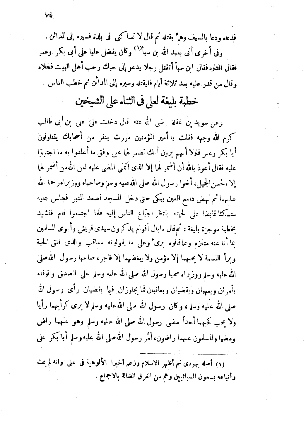 وفي أخرى: أتي بعبد الله بن سبأ وكان يفضل عليا على أبي بكر وعمر فقال: اقتلوه، فقال ابن سبأ: أتقتل رجلا يدعو إلى حبك وحب أهل البيت، فخلاه وقال: من قدر عليه بعد ثلاثة أيام فليقتله، وسيره إلى المدائن ثم خطب الناس.