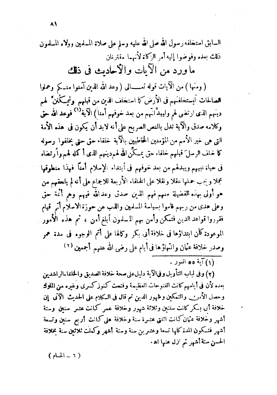 ومنها: من الآيات قوله تعالى: {وعد الله الذين آمنوا منكم وعملوا الصالحات ليستخلفنهم في الأرض كما استخلف الذين من قبلهم وليمكنن لهم دينهم الذي ارتضى لهم وليبدلنهم من بعد خوفهم أمنا} تدل بالنص الصريح على أنه لا أن يكون في هذه الأمة التي هي خير الأمم من المؤمنين المخاطبين بالآية خلفاء حق حتى يخلفون رسوله، كما خلف الرسل قبلهم خلفاء حق يمكن لهم دينهم الذي أكمله لهم وارتضاه في حياة نبيهم، ويبدلهم من بعد خوفهم في ابتداء الإسلام أمنا فهذا منطوقها مجملا. ويجب حملها عقلا ونقلا على الخلفاء الأربعة للإجماع على أنه لم يلحقهم من هو أولى بهذه الفضيلة منهم، فهم الذين صدق وعد الله فيهم، وهم أئمة حق، وعلى هدى من ربهم، قاموا بسياسة المسلمين والذب عن حوزة الإسلام أتم قيام فقرروا قواعد الدين فتمكن وأمن بهم المسلمون أبلغ أمن، ثم هذه الأمور الموعودة كان ابتداؤها في خلافة أبي بكر وكمالها على أتم الوجوه في مدة خلافة عمر وصدر خلافة عثمان، وانتهاؤها في إمامة علي رضي الله عنهم أجمعين.