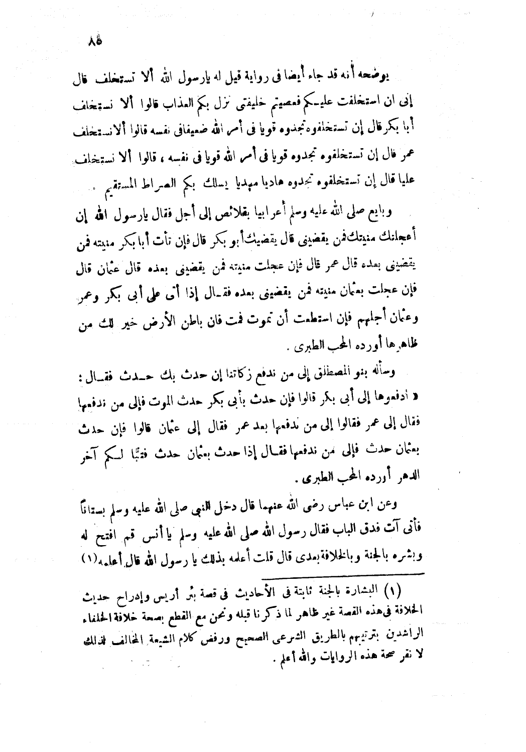 وعن ابن عباس رضي الله عنهما قال: دخل النبي - صلى الله عليه وسلم - بستانا فأتى آت فدق الباب فقال رسول الله - صلى الله عليه وسلم -: "يا أنس قم افتح الباب له وبشره بالجنة وبالخلافة بعدي"، قال قلت: أعلمه بذلك يا رسول الله؟ قال: "أعلمه"،