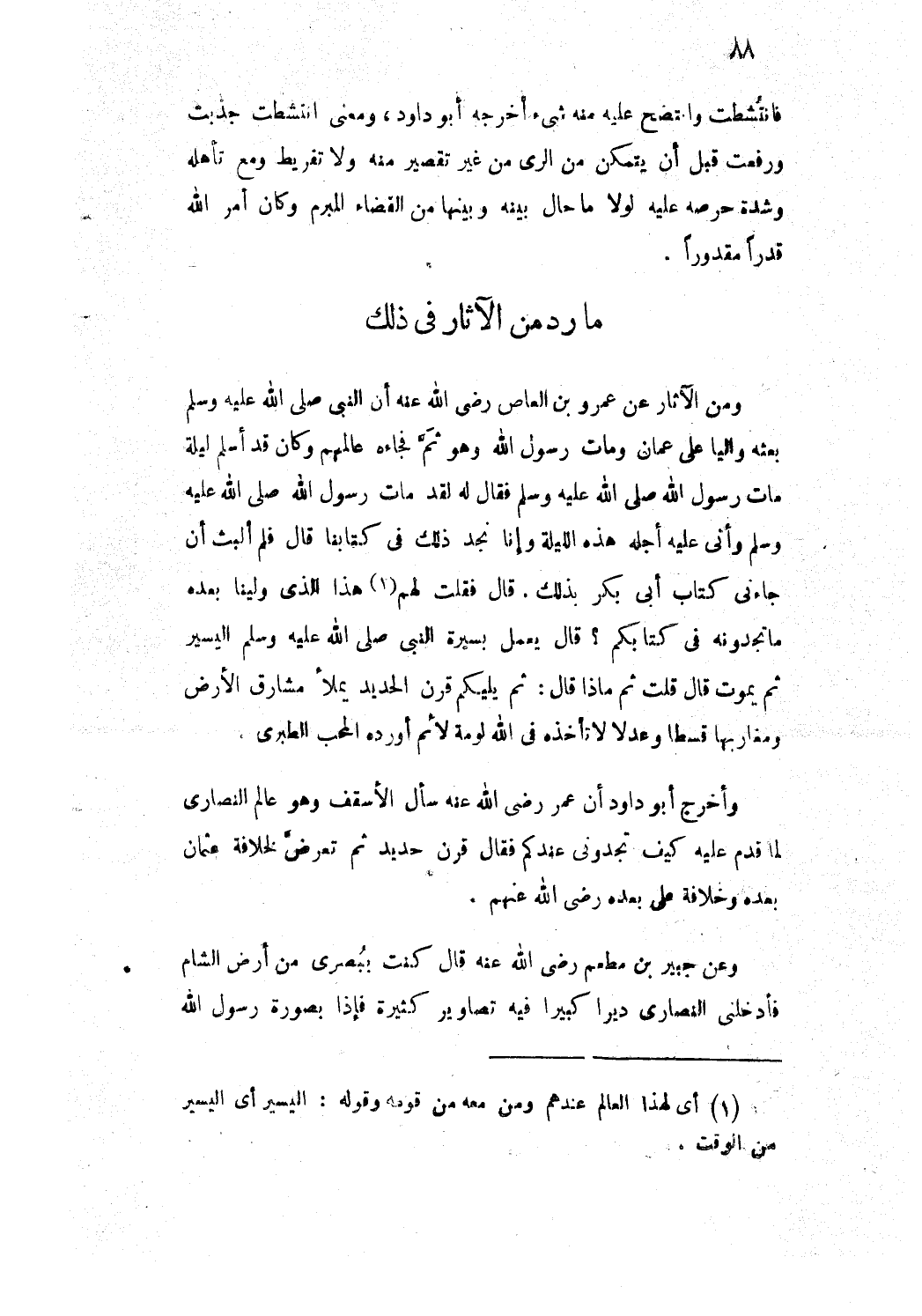 ومن الآثار عن عمرو بن العاص رضي الله عنه أن النبي - صلى الله عليه وسلم - بعثه واليا على عمان، ومات رسول الله - صلى الله عليه وسلم - وهو ثم، فجاء عالمهم وكان قد أسلم ليلة مات رسول الله - صلى الله عليه وسلم - فقال له: قد مات رسول الله - صلى الله عليه وسلم - وأتى عليه هذه الليلة، وأتى نحو ذلك في كتابنا، قال: فلم ألبث أن جاءني كتاب أبي بكر بذلك، فقلت لهم: هذا الذي ولينا بعده ما تجدونه في كتابكم؟ قال: يسيرا ثم يموت، قال: قلت: ثم ماذا؟ قالوا: ثم يليكم قرن الحديد يعمل بسيرة النبي - صلى الله عليه وسلم -، يملأ مشارق الأرض ومغاربها قسطا وعدلا لا تأخذه في الله لومة لائم. أورده المحب الطبري. وأخرج أبو داود أن عمر رضي الله عنه سأل الأسقف وهو عالم النصارى لما قدم عليه كيف تجدوني عندكم؟ فقال: قرن حديد. ثم تعرض لخلافة عثمان بعده وخلافة علي بعده رضي الله عنهم.