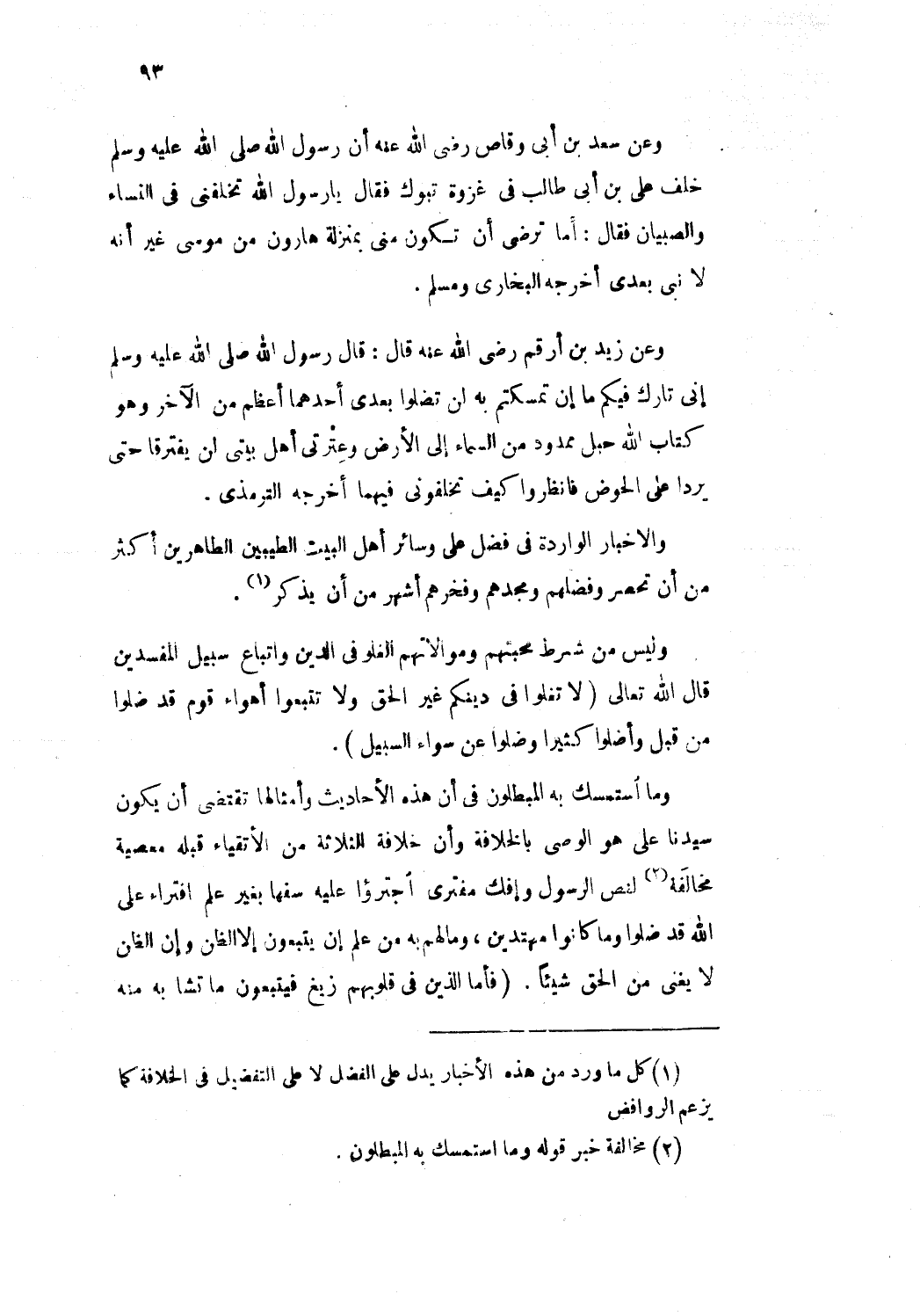 وما استمسك به المبطلون في أن هذه الأحاديث وأمثالها تقتضي أن يكون سيدنا علي هو الوصي بالخلافة وأن خلافة الثلاثة من السادة الأتقياء قبله معصية مخالفة لنص الرسول: إفك مفترى اجترأوا عليه سفها بغير علم افتراء على الله، قد ضلوا وما كانوا مهتدين، ما لهم به من علم إن يتبعون إلا الظن، وإن الظن لا يغني من الحق شيئا، {فأما الذين في قلوبهم مرض فيتبعون ما تشابه منه
