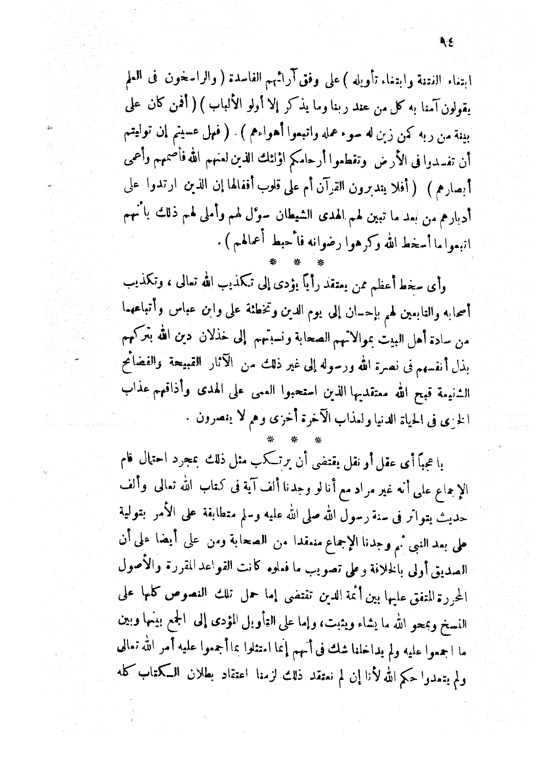يا عجبا أي عقل أو نقل يقضي أن يرتكب مثل ذلك بمجرد احتمال قام الإجماع على أنه غير مراد. مع أنا لو وجدنا ألف آية في كتاب الله وألف حديث يتواتر في سنة رسول الله - صلى الله عليه وسلم - متطابقة على الأمر بتولية علي بعد النبي، ثم وجدنا الإجماع منعقد من الصحابة ومن علي أيضا على أن الصديق أولى بالخلافة على تصويب ما فعلوه، كانت القواعد المقررة والأصول المحررة المتفق عليه بين أئمة الدين تقتضي إما حمل تلك النصوص كلها على النسخ ويمحو الله ما يشاء ويثبت، وإما على التأويل اللائق المؤدي إلى الجمع بينها وبين ما أجمعوا عليه؛ ولم يداخلنا شك في أنهم إنما امتثلوا بما أجمعوا عليه أمر الله تعالى ولم يتعدوا حكم الله. لأنا إن لم نعتقد ذلك لزمنا اعتقاد بطلان الكتاب كله