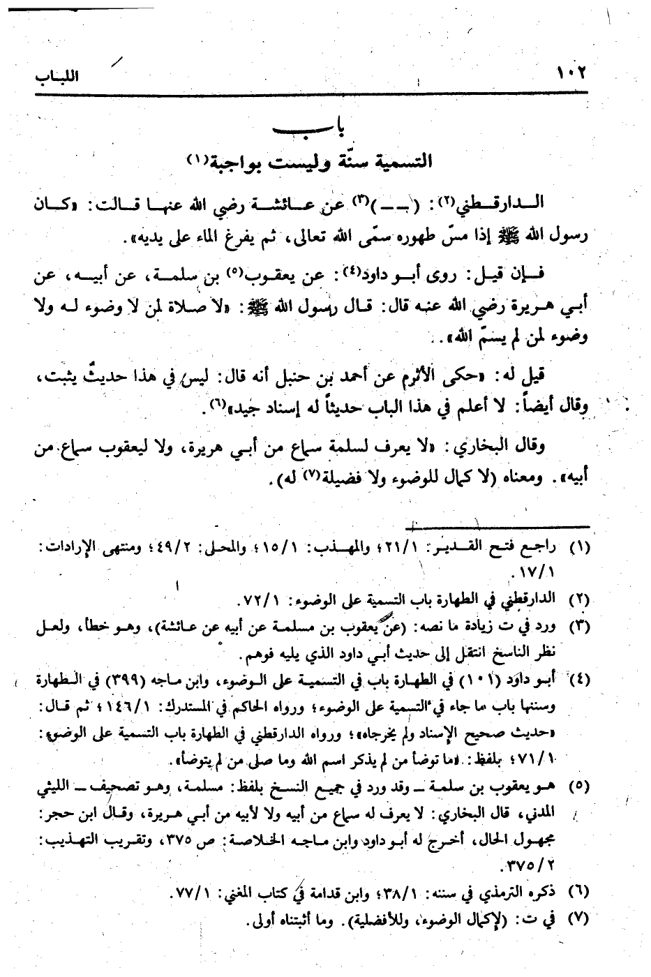 الدَّارَقُطْنِيّ: عَن عَائِشَة رَضِي الله عَنْهَا قَالَت: " كَانَ رَسُول الله [صلى الله عَلَيْهِ وَسلم] إِذا مس طهوره سمى الله تَعَالَى، ثمَّ يفرغ المَاء على يَدَيْهِ ".