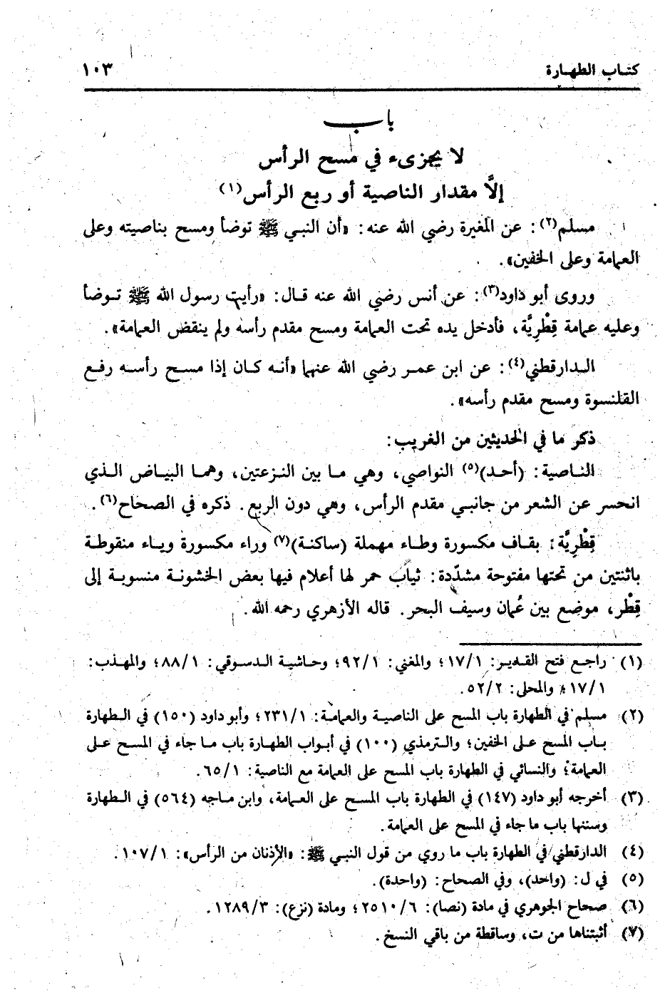 مُسلم: عَن الْمُغيرَة رَضِي الله عَنهُ: " أَن النَّبِي [صلى الله عَلَيْهِ وَسلم] تَوَضَّأ وَمسح بناصيته وعَلى الْعِمَامَة وعَلى الْخُفَّيْنِ ".