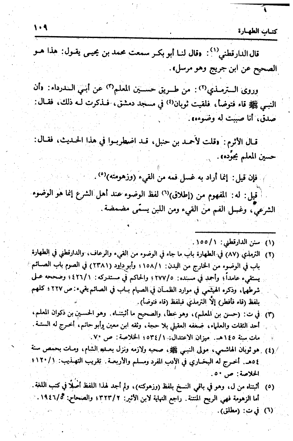 وروى التِّرْمِذِيّ: من طَرِيق حُسَيْن الْمعلم عَن أبي الدَّرْدَاء: " أَن النَّبِي [صلى الله عَلَيْهِ وَسلم] قاء فَتَوَضَّأ، فَلَقِيت ثَوْبَان فِي مَسْجِد دمشق، فَذكرت لَهُ ذَلِك، فَقَالَ: صدق، أَنا صببت لَهُ وضوءه ".
