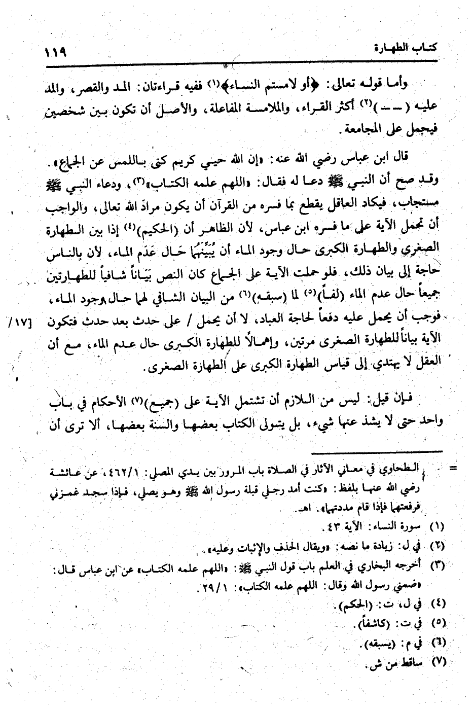 قَالَ ابْن عَبَّاس رَضِي الله عَنهُ: " إِن الله حييّ كريم كنى باللمس عَن الْجِمَاع ". وَقد صَحَّ أَن النَّبِي [صلى الله عَلَيْهِ وَسلم] دَعَا لَهُ فَقَالَ: " اللَّهُمَّ علمه الْكتاب "، وَدُعَاء النَّبِي [صلى الله عَلَيْهِ وَسلم] مستجاب، فيكاد الْعَاقِل يقطع بِمَا فسره من الْقُرْآن أَن يكون مُرَاد الله تَعَالَى، وَالْوَاجِب أَن تحمل الْآيَة على مَا فسره ابْن عَبَّاس، لِأَن الظَّاهِر أَن (الْحَكِيم) إِذا بَين الطَّهَارَة الصُّغْرَى وَالطَّهَارَة الْكُبْرَى حَال وجود المَاء أَن يبينهما حَال عدم المَاء، لِأَن بِالنَّاسِ حَاجَة إِلَى بَيَان ذَلِك، فَلَو حملت الْآيَة على الْجِمَاع كَانَ النَّص بَيَانا شافيا للطهارتين جَمِيعًا حَال عدم المَاء (لفا) لما (سبقه) من الْبَيَان الشافي لَهما حَال وجود المَاء، فَوَجَبَ أَن يحمل عَلَيْهِ دفعا لحَاجَة الْعباد، لَا أَن يحمل / على حدث بعد حدث فَتكون الْآيَة بَيَانا للطَّهَارَة الصُّغْرَى مرَّتَيْنِ، وإهمالا للطَّهَارَة الْكُبْرَى حَال عدم المَاء، مَعَ أَن الْعقل لَا يَهْتَدِي إِلَى قِيَاس الطَّهَارَة الْكُبْرَى على الطَّهَارَة الصُّغْرَى.