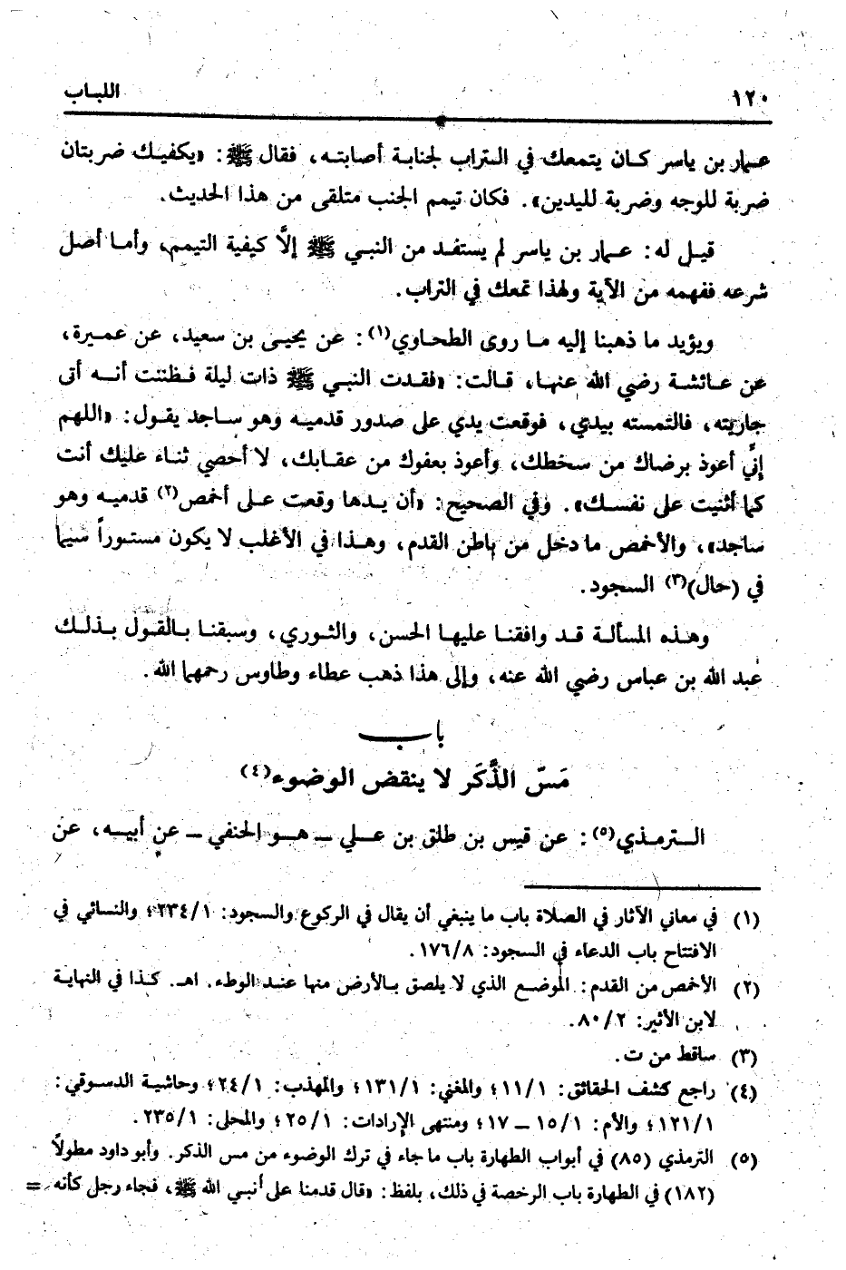 وَيُؤَيّد مَا ذَهَبْنَا إِلَيْهِ مَا روى الطَّحَاوِيّ: عَن يحيى بن سعيد، عَن عميرَة، عَن عَائِشَة رَضِي الله عَنْهَا، قَالَت: " فقدت النَّبِي [صلى الله عَلَيْهِ وَسلم] ذَات لَيْلَة فَظَنَنْت أَنه أَتَى جَارِيَته، فالتمسته بيَدي، فَوَقَعت يَدي على صُدُور قَدَمَيْهِ وَهُوَ ساجد يَقُول: " اللَّهُمَّ إِنِّي أعوذ برضاك من سخطك، وَأَعُوذ بعفوك من عقابك، لَا أحصي ثَنَاء عَلَيْك أَنْت كَمَا أثنيت على نَفسك ". وَفِي الصَّحِيح: " أَن يَدهَا وَقعت على أَخْمص قَدَمَيْهِ وَهُوَ ساجد "، والأخمص مَا دخل من بَاطِن الْقدَم، وَهَذَا فِي الْأَغْلَب لَا يكون مَسْتُورا سِيمَا فِي (حَال) السُّجُود. وَهَذِه الْمَسْأَلَة قد وَافَقنَا عَلَيْهَا الْحسن، وَالثَّوْري، وسبقنا بالْقَوْل بذلك عبد الله بن عَبَّاس رَضِي الله عَنهُ، وَإِلَى هَذَا ذهب عَطاء وَطَاوُس رحمهمَا الله.