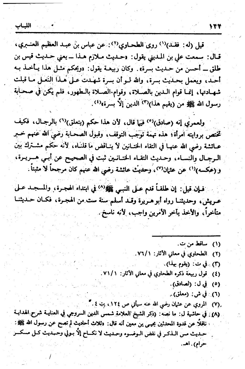 قيل (لَهُ: فقد) روى الطَّحَاوِيّ: عَن عَبَّاس بن عبد الْعَظِيم الْعَنْبَري، قَالَ: سَمِعت عَليّ بن الْمَدِينِيّ يَقُول: " حَدِيث ملازم هَذَا - يَعْنِي حَدِيث قيس بن طلق - أحسن من حَدِيث بسرة ". وَكَانَ ربيعَة يَقُول: " وَيحكم مثل هَذَا يَأْخُذ بِهِ أحد، وَيعْمل بِحَدِيث بسرة، وَالله لَو أَن بسرة شهِدت على هَذَا النَّعْل مَا قبلت شهادتها، إِنَّمَا قوام الدّين بِالصَّلَاةِ، وقوام الصَّلَاة بالطهور، فَلم يكن فِي صحابة رَسُول الله [صلى الله عَلَيْهِ وَسلم] من (يُقيم هَذَا) الدّين إِلَّا بسرة ".