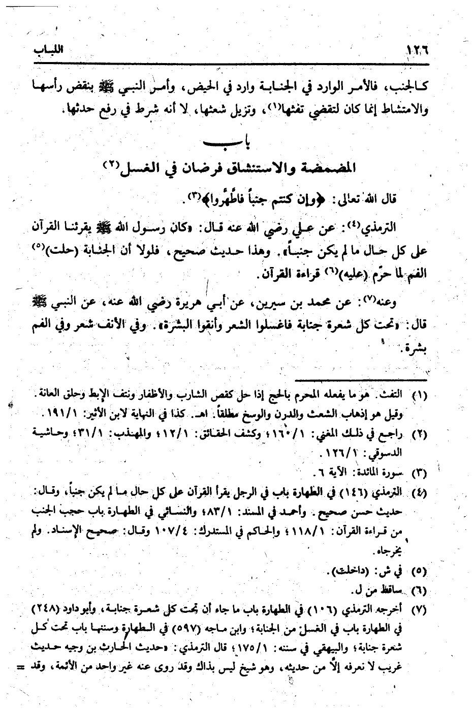 التِّرْمِذِيّ: عَن عَليّ رَضِي الله عَنهُ قَالَ: " كَانَ رَسُول الله [صلى الله عَلَيْهِ وَسلم] يقرئنا الْقُرْآن على كل حَال مَا لم يكن جنبا ". وَهَذَا حَدِيث صَحِيح، فلولا أَن الْجَنَابَة (حلت) الْفَم لما حرم (عَلَيْهِ) قِرَاءَة الْقُرْآن.
