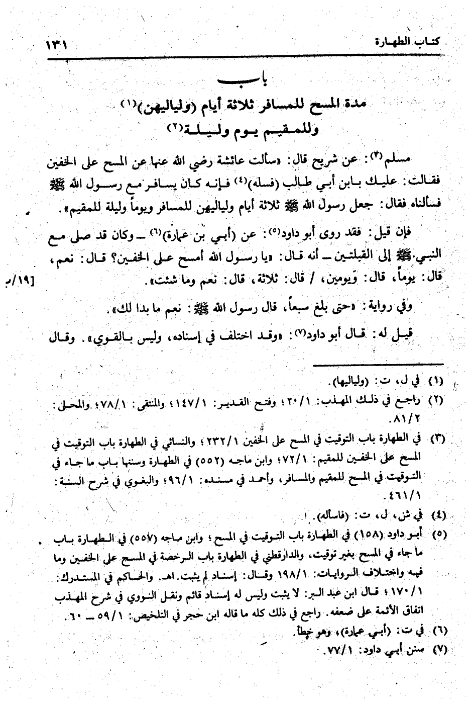 مُسلم: عَن شُرَيْح قَالَ: " سَأَلت عَائِشَة رَضِي الله عَنْهَا عَن الْمسْح على الْخُفَّيْنِ فَقَالَت: عَلَيْك بِابْن أبي طَالب (فسله) فَإِنَّهُ كَانَ يُسَافر مَعَ رَسُول الله [صلى الله عَلَيْهِ وَسلم] فَسَأَلْنَاهُ فَقَالَ: جعل رَسُول الله [صلى الله عَلَيْهِ وَسلم] ثَلَاثَة أَيَّام ولياليهن للْمُسَافِر وَيَوْما وَلَيْلَة للمقيم ".