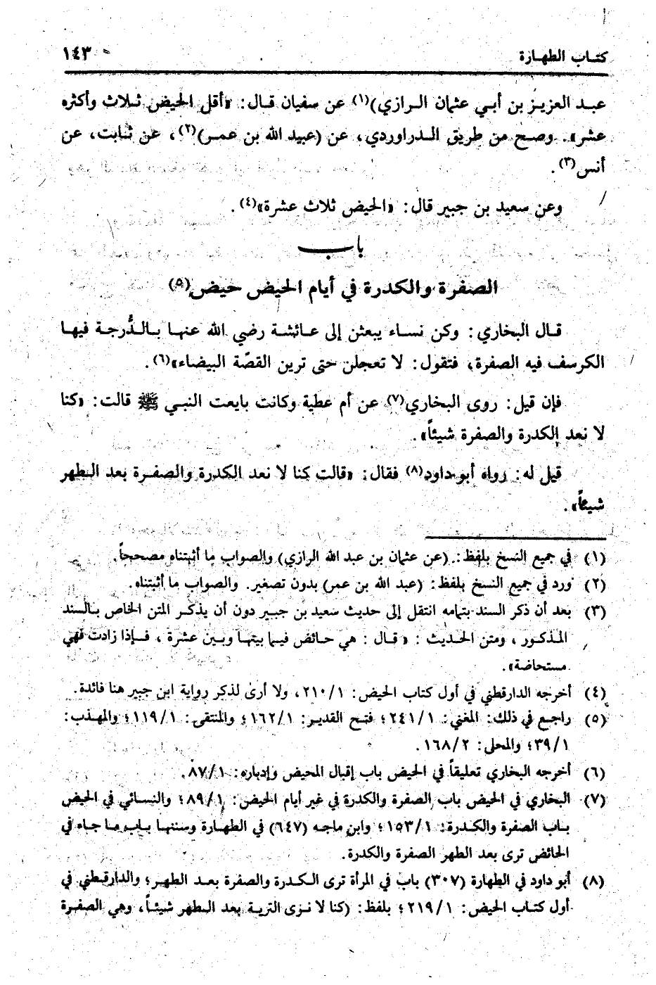 عبد الْعَزِيز بن أبي عُثْمَان الرَّازِيّ) عَن سُفْيَان قَالَ: " أقل الْحيض ثَلَاث وَأَكْثَره عشر ". وَصَحَّ من طَرِيق الدَّرَاورْدِي، عَن (عبيد الله بن عمر) ، عَن ثَابت، عَن أنس.