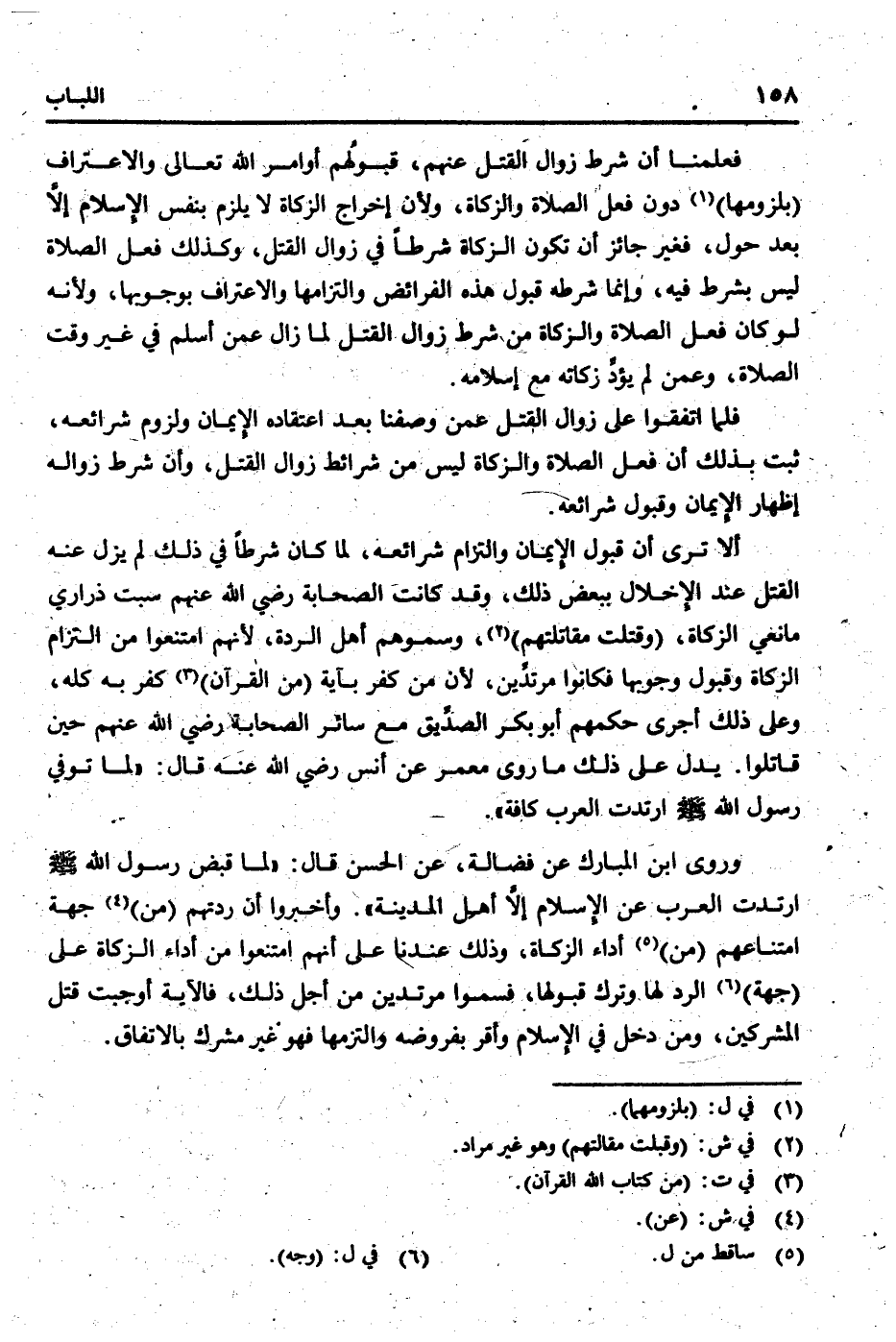 أَلا ترى أَن قبُول الْإِيمَان والتزام شرائعه، لما كَانَ شرطا فِي ذَلِك لم يزل عَنهُ الْقَتْل عِنْد الْإِخْلَال بِبَعْض ذَلِك، وَقد كَانَت الصَّحَابَة رَضِي الله عَنْهُم سبت ذَرَارِي مانعي الزَّكَاة، (وَقتلت مُقَاتلَتهمْ) ، وسموهم أهل الرِّدَّة، لأَنهم امْتَنعُوا من الْتِزَام الزَّكَاة وَقبُول وُجُوبهَا فَكَانُوا مرتدين، لِأَن من كفر بِآيَة (من الْقُرْآن) كفر بِهِ كُله، وعَلى ذَلِك أجْرى حكمهم أَبُو بكر الصّديق مَعَ سَائِر الصَّحَابَة رَضِي الله عَنْهُم حِين قَاتلُوا. يدل على ذَلِك مَا روى معمر عَن أنس رَضِي الله عَنهُ قَالَ: " لما توفّي رَسُول الله [صلى الله عَلَيْهِ وَسلم] ارْتَدَّت الْعَرَب كَافَّة ".