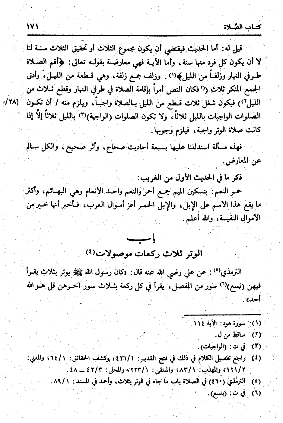 قيل لَهُ: أما الحَدِيث فَيَقْتَضِي أَن يكون مَجْمُوع الثَّلَاث أَو تَحْقِيق الثَّلَاث سنة لنا لَا أَن يكون كل فَرد مِنْهَا سنة، وَأما الْآيَة فَهِيَ مُعَارضَة بقوله تَعَالَى: {أقِم الصَّلَاة طرفِي النَّهَار وَزلفًا من اللَّيْل} . وزلف جمع زلفة، وَهِي قِطْعَة من اللَّيْل، وَأدنى الْجمع الْمُنكر ثَلَاث (فَكَانَ النَّص أمرا بِإِقَامَة الصَّلَاة فِي طرفِي النَّهَار وَقطع ثَلَاث من اللَّيْل) فَيكون شغل ثَلَاث قطع من اللَّيْل بِالصَّلَاةِ وَاجِبا، وَيلْزم مِنْهُ / أَن تكون الصَّلَوَات الْوَاجِبَات بِاللَّيْلِ ثَلَاثًا، وَلَا تكون الصَّلَوَات (الْوَاجِبَة) بِاللَّيْلِ ثَلَاثًا إِلَّا إِذا كَانَت صَلَاة الْوتر وَاجِبَة، فَيلْزم وُجُوبهَا.